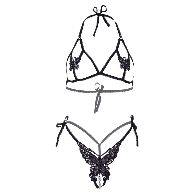 Conjunto de 2 peças. Sutiã de copa aberta com aplique de borboleta e fio dental borboleta de cordão de pérolas lateral da prestigiosa marca de lingerie Leg Avenue. Aumente sua feminilidade adquirindo uma peça exclusiva de sedução, sensualidade e elegância.