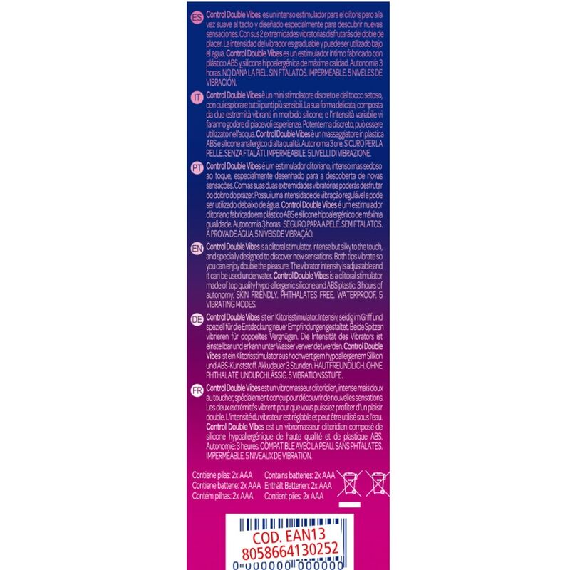 Com seus 2 membros vibratórios você desfrutará do dobro do prazer. A intensidade do vibrador é ajustável e pode ser usado debaixo d’água. Control Double Vibes é um estimulador íntimo feito com plástico ABS e silicone hipoalergênico da mais alta qualidade.