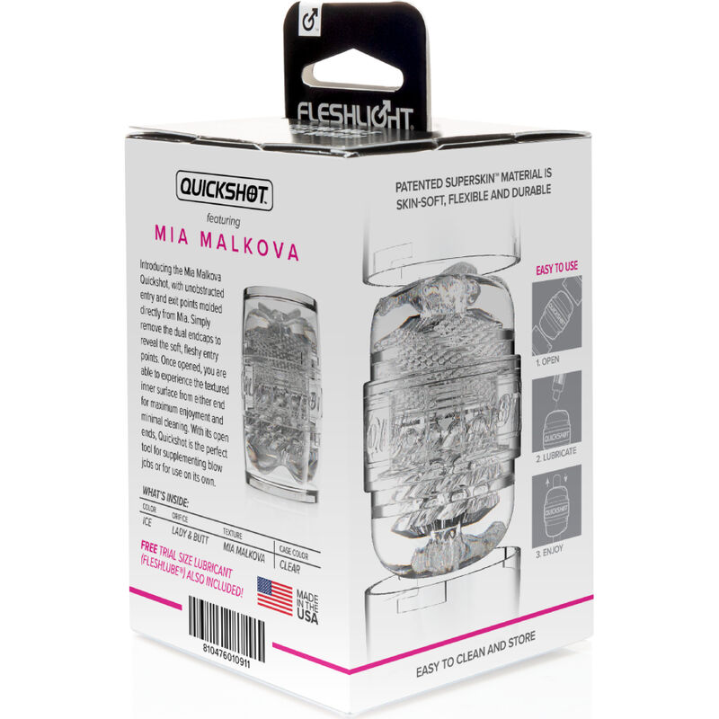 Mia Malkova Quickshot apresenta pontos de saída desobstruídos moldados a partir da vagina e bumbum de Mia. O Quickshot de Mia Malkova pode ser usado como estimulação adicional durante o jogo oral de um parceiro ou para masturbação.