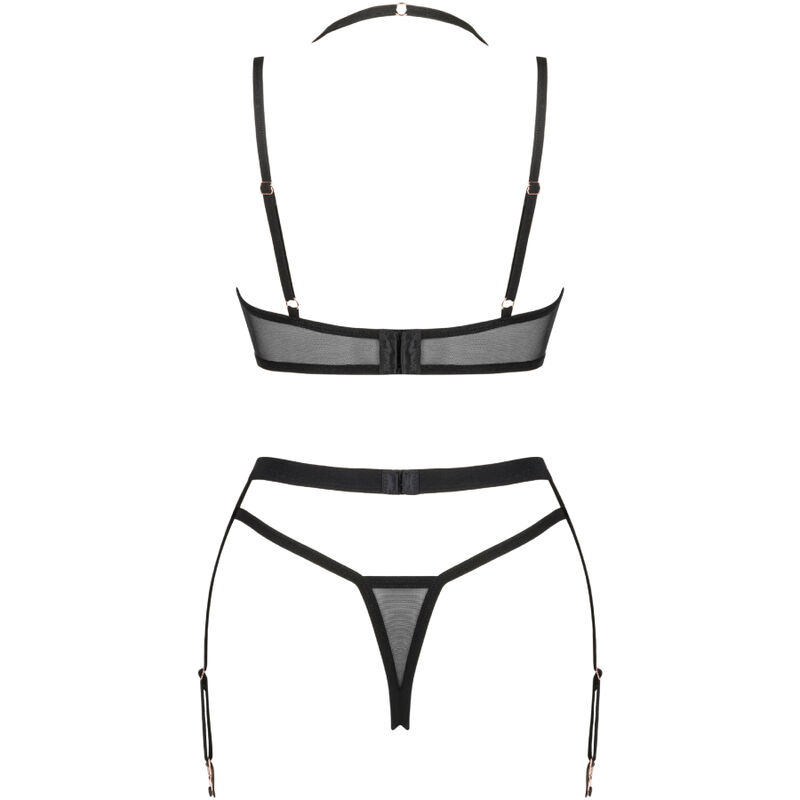 - um conjunto de três peças preto contendo sutiã, tanga e cinta-liga