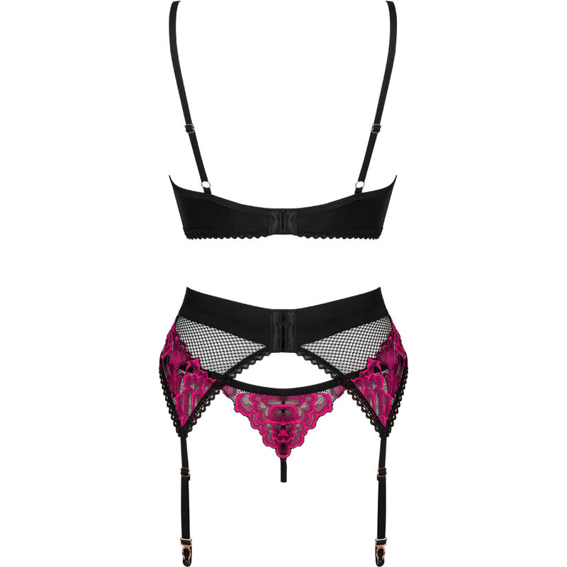- Conjunto de lingerie composto por sutiã, tanga e cinta-liga.