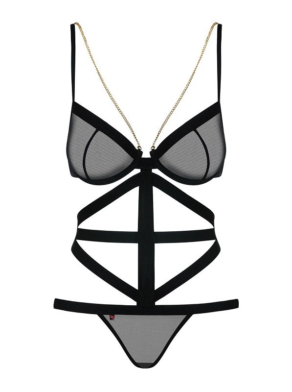 Bondy é um fabuloso teddy em cor negra de um design exclusivo inspirado em um estilo moderno, casual e muito sensual, incluindo cadeias metálicas em cor dourada desde o topo até os homens, fabricado e concebido pela prestigiosa marca Obsessive